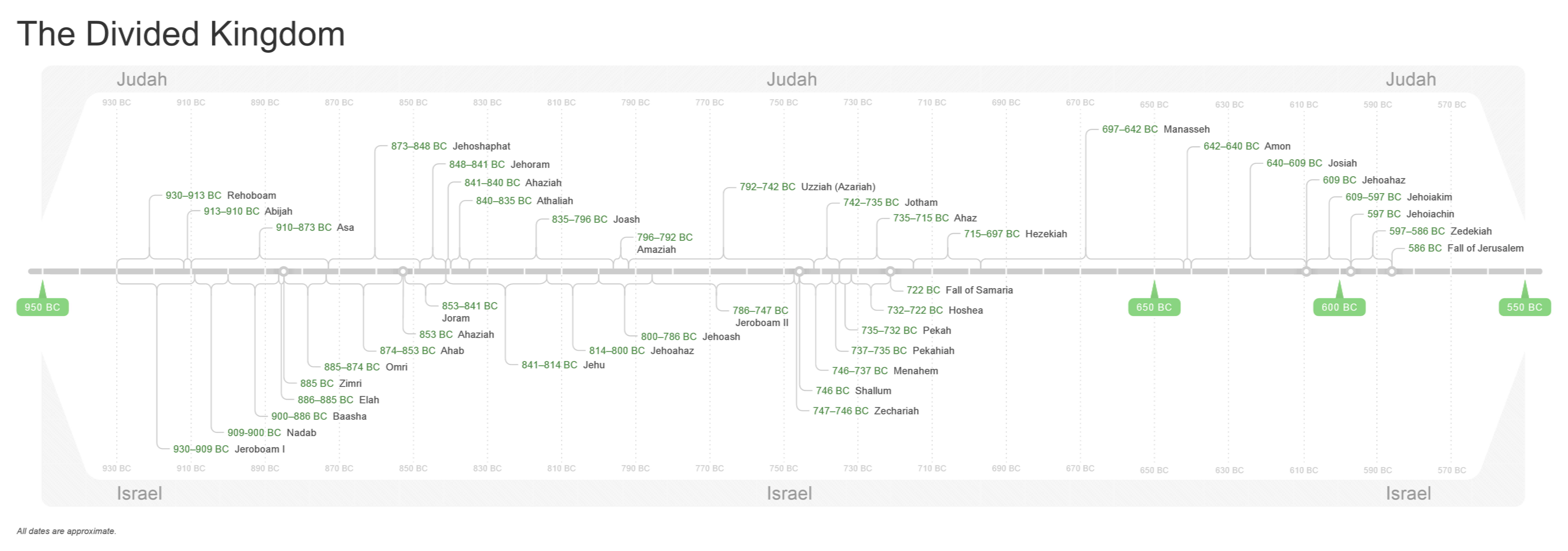 Straight away we get into the complicated parallel timeline of Israel (which from now on means the Northern Kingdom, following Jeroboam) and Judah (the Southern Kingdom, with Jerusalem and David’s descendants on the throne there). I remember when I was first finding my way around the Bible getting thoroughly lost at this point! The following timeline and map may or may not help to keep track…